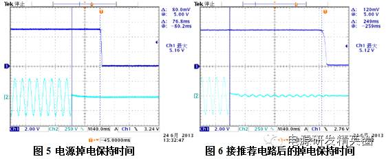 為驗證理論分析和計算的正確性,選取MORNSUN的LH25-10B05來進行測試。在輸入電壓220Vac,負載4A的條件下,LH25-10B05的掉電保持時間為76.8ms,波形如圖5所示;按推薦電路外接100uF/400V輸入濾波電容后,電源的掉電保持時間增加到249ms,波形如圖6所示。試驗結果與理論計算結果吻合。