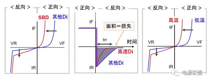 再重復一遍,左圖表示SBD與其他三種二極管相比,VF較低,IR較大。
