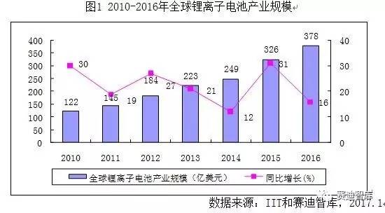 2016年,全球充電機充電鋰離子電池產業規模預計達到378億美元,同比增長16%,增速較2015年下滑了15個百分點,原因主要在于全球電動汽車市場增速明顯下滑。