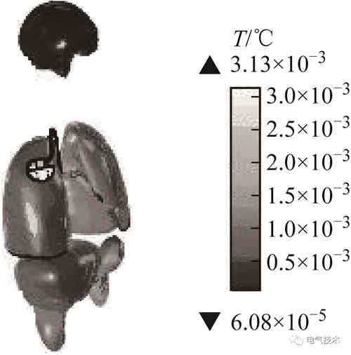 圖2:植入起搏器后溫升分布(心臟起搏器最大溫升為3.13×10-3℃,植入心臟起搏器后人體主要器官溫度并未發(fā)生明顯變化。)