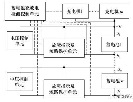在圖1中,蓄電池組根據充電需要,是用多臺或一臺充電機對其進行充電,或者多臺、一臺充電機對多組蓄電池組進行充電,采用恒電流充電和恒電壓充電相結合的方法,以及相應的蓄電池組管理系統構成,目前還沒有配置均壓控制的功能[11-12]。